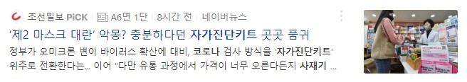 오미크론 변이 바이러스 확산에 대비, 코로나 검사 방식을 '자가진단키트'위주로 전환한다는 소식이 나오자 품귀 현상 조짐이 나타나고 있는데요 지난 마스크 대란때처럼 불편한 사태가 벌어질 것을 우려한 시민들의 불안때문 것으로 풀이되고 있습니다