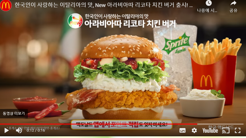 오늘 점심메뉴 뭐먹을지 결정하지 못하셨다면 맥도날드 아라비아따 리코타 치킨버거 어떠세요???