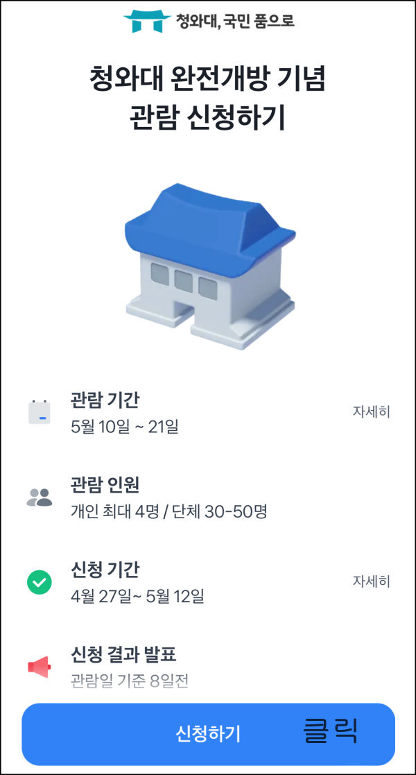 현재 예약신청을 받고 있는 청와대 관람일은 5월 10일 ~ 5월 21일 까지이며
