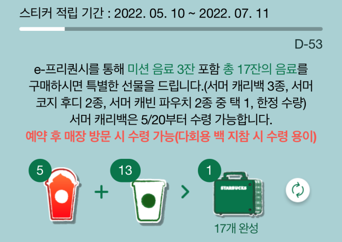 스타벅스 프리퀀시 적립기간은 7월 11일까지고 증정품 예약 수령은 7월 18일까지 가능해요