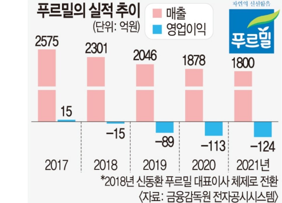 푸르밀은 2009년 부터 2017년까지 전문경영인 남우식 전 대표 체제에서 꾸준히 영업이익을 내다 2018년 신준호 푸르밀 회장의 차남인 신동환 대표이사 체제로 바뀌면서 반전됩니다.