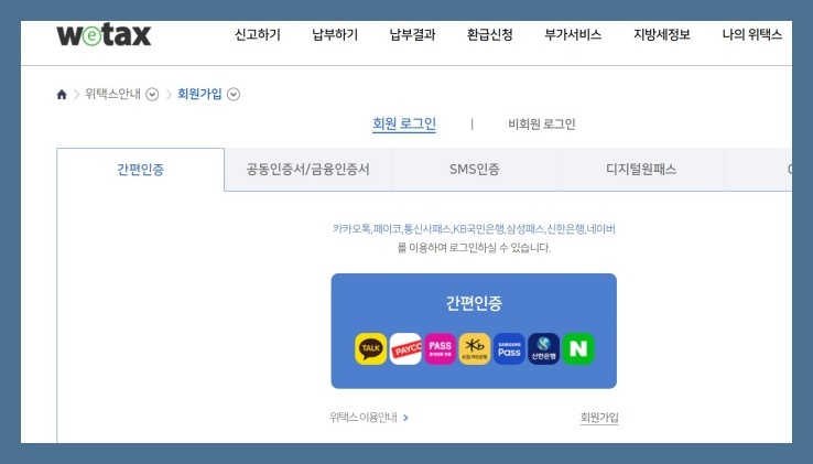 로그인하는 방법은 가입을 하지 않더라도 공동인증서, 금융인증서, 간편인증으로 카카오톡, 페이코, 패스, 네이버 등 다양한 방법으로 개인확인 후 로그인이 가능합니다