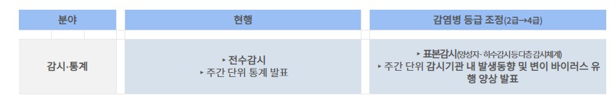 4급 감염병으로 전환됨에 따라 기존 전수감시 체계에서 표본감시 체계로 전환됩니다. 표본감시 전환 이후에도 효과적인 모니터링과 변이 감시를 위해 코로나19 검가 양성자 감시, 하수 감시 등 다층 감시체계를 운영합니다.