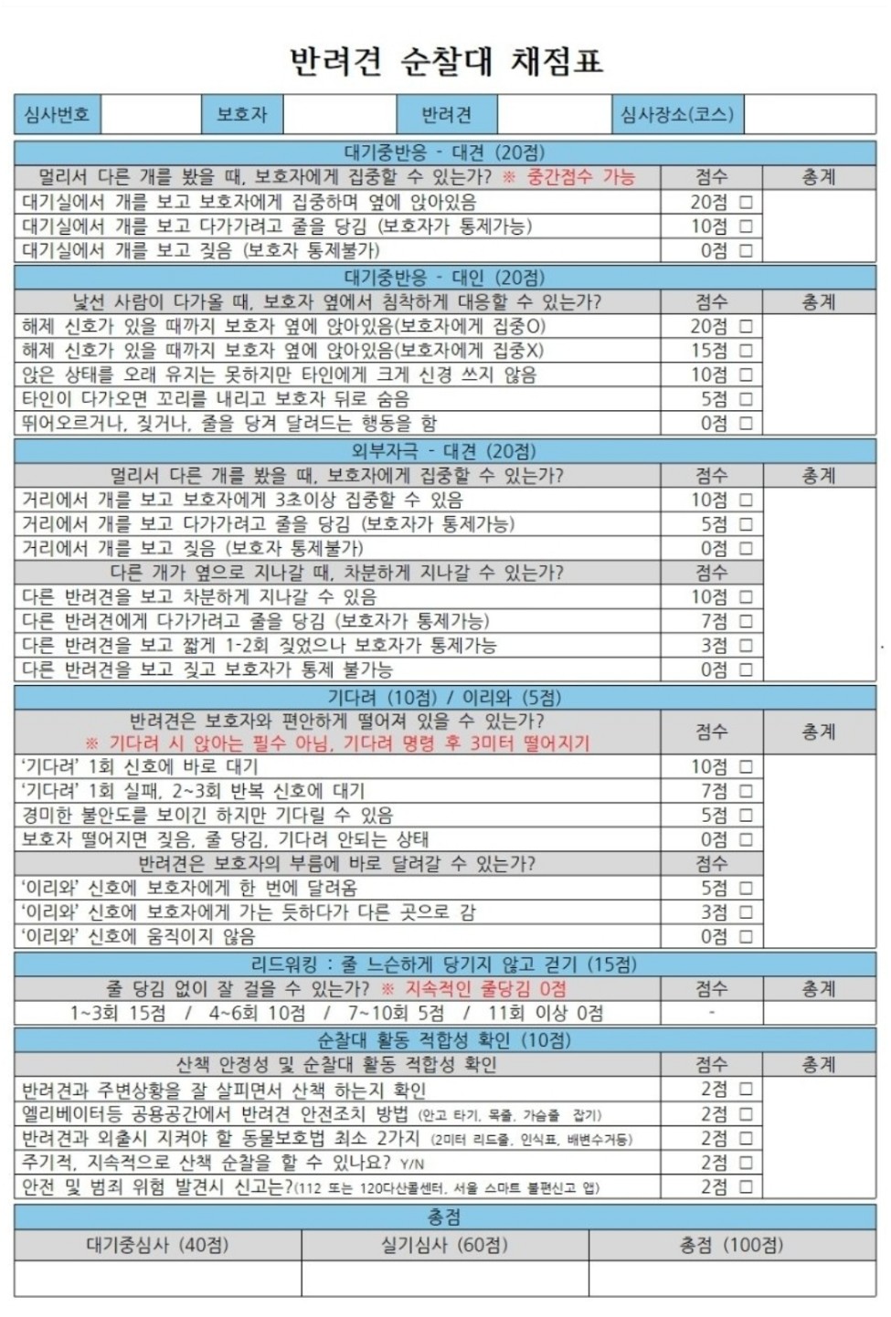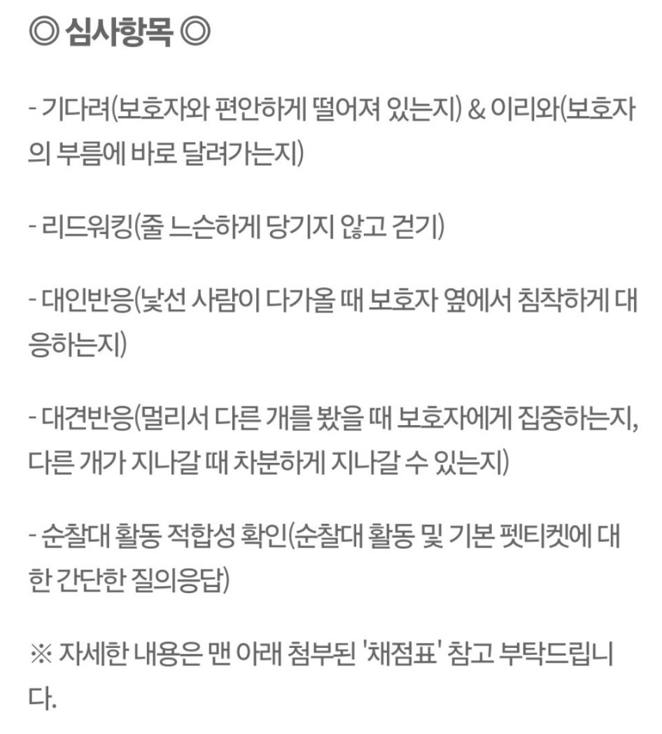 반려견 순찰대는 1차 서류심사 40점, 2차 실기심사 60점 총점 100점으로 세분화 되어진 채점표로 점수를 매기며 반려견 순찰대 심사기준에 적합할 경우 최종 선발이 됩니다