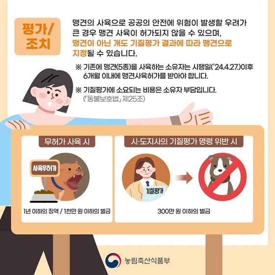 맹견 사육 허가는 맹견 위험도 등을 고려해 여부가 결정되며 사고 방지 등을 위한 교육 등 추가 조치가 이루어 집니다