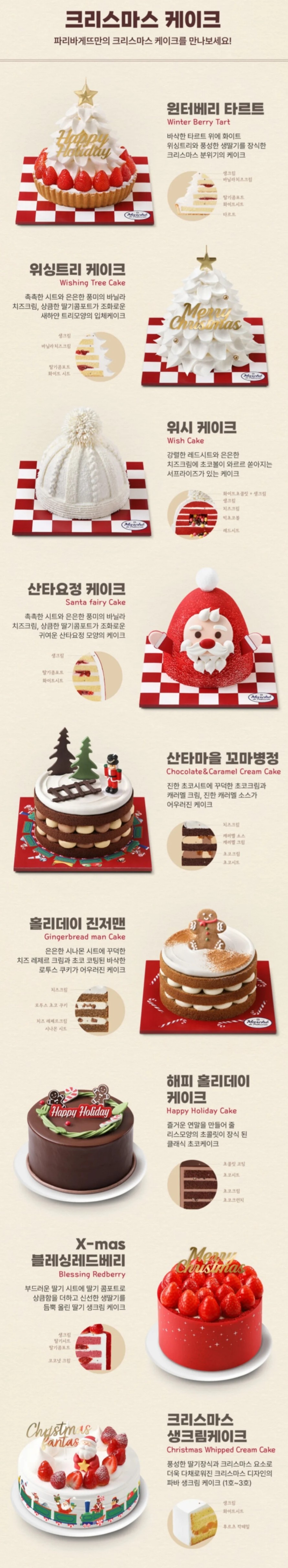 파리바게트 케이크는 타르트 위에 생딸기를 장식한 케이크, 트리모양의 바닐라치즈크림으로 꾸며진 입체케이크, 귀여운 산타요정케이크 등을 선보였어요