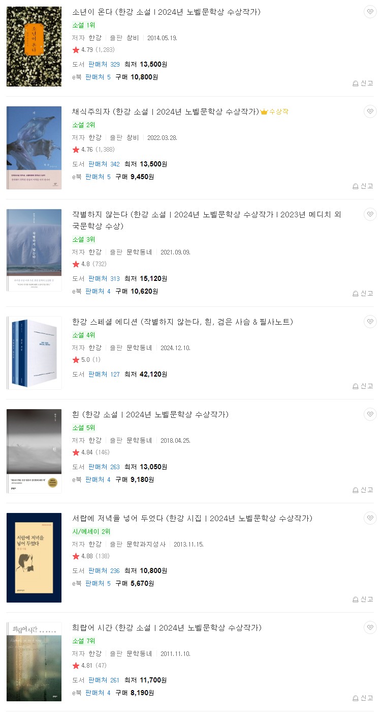 노벨문학상 수상 작가 한강의 작품