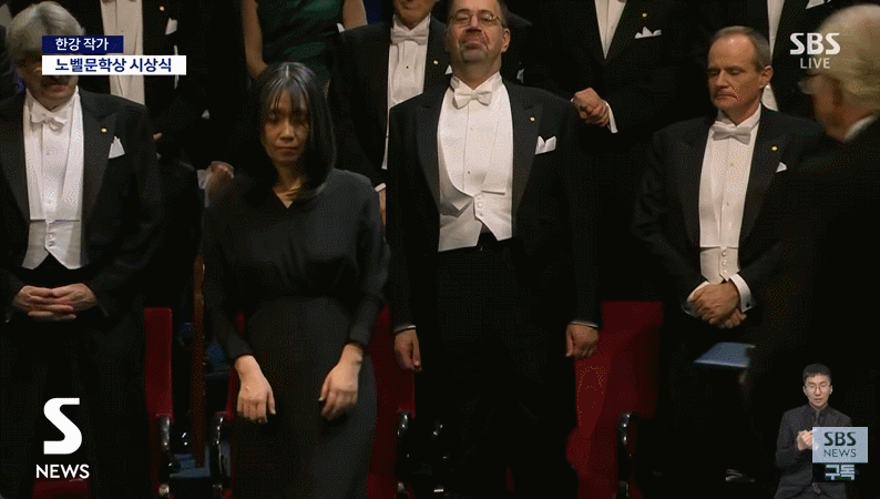 오케스트라 연주로 모차르트의 행진곡이 울려펴진뒤 검은색 드레스를 입은 한강이 다른 수상자들과 함께 입장했습니다