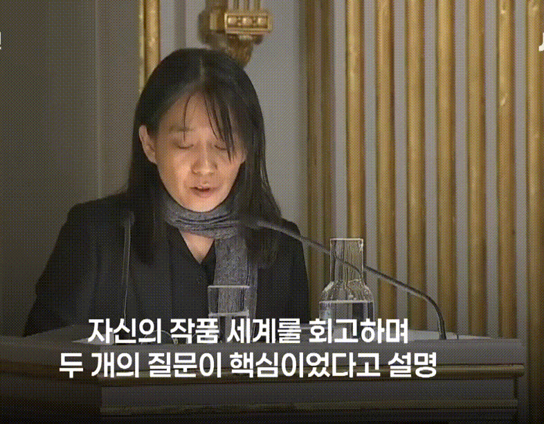 한강 작가는 노벨문학상 수상작가 강연 '빛과 실'에서 자신의 작품세계를 회고하며 두 개의 질문이 핵심이었다고 설명했습니다.