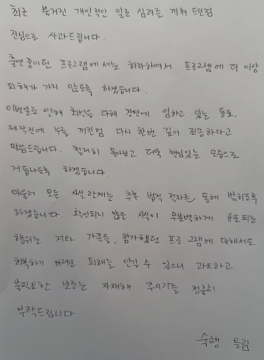 출연중이던 프로그램에서는 하차하여서 프로그램에 더이상 피해가 가지 않도록 하겠습니다.